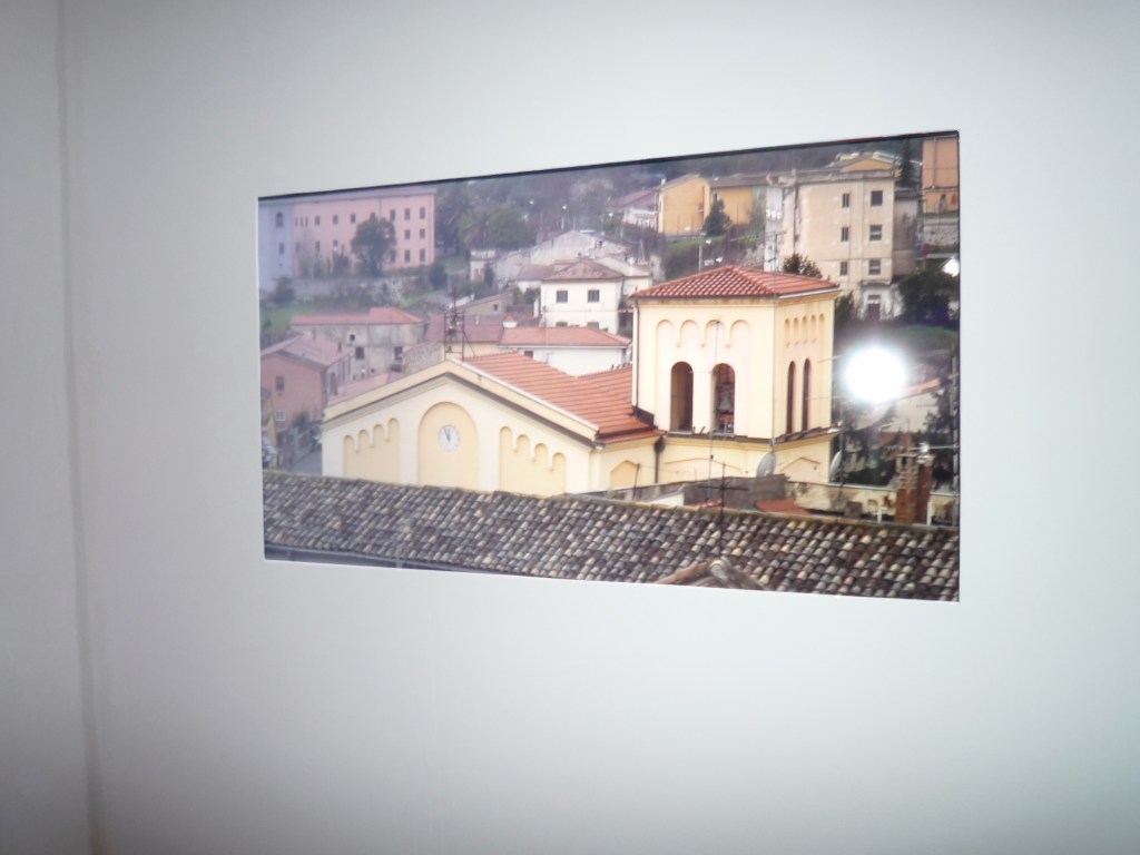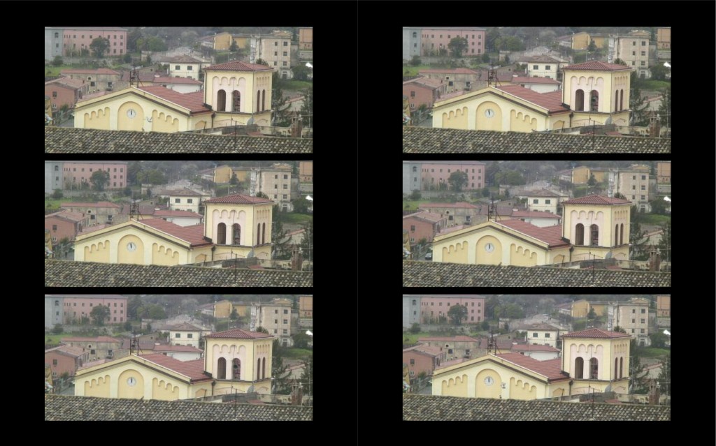 Filmed in the town of Venafro, in Molise, Quattro Minuti di Mezzogiorno (2010), a monitor-based video and sound installation by Stephen Partridge and Elaine Shemilt, employs a fixed camera position which at first frustrates before revealing the very immediacy of its story. At the announcement of midday, the many church bells of Venafro compete in succession for almost 240 seconds and we realise that we can no longer trust technologies as there is in fact, no single moment of midday. Partridge and Shemilt have collaborated for over ten years working with film, video, sound and installation, exploring and deconstructing systems of language in order to reveal their structures and suggest possibilities which may arise from them. The sound from Quattro Minuti di Mezzogiorno resonates throughout all the spaces within the gallery, pervading our reading of each work and the picture we construct as a whole, gently undermining the very measurement of Time and in doing so, the institutions that profess to announce it. – Deirdre MacKenna