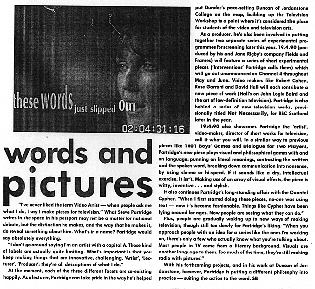 “The television series of TV Interventions, 19:4:90, was a different matter all together. Inspired by David Hall’s 7 TV Pieces of 1971, Steve Partridge came up with the idea of making short works to celebrate Glasgow as Europe’s Cultural Capital in 1990. In the same way as the TV Pieces appeared on Scottish Television in 1971, these would crop up within the stream of programming and be repeated as many times as possible. Channel 4 seemed the obvious place. Although Jeremy Isaacs had left for the delights of Covent Garden, Mike Bolland, whom he had appointed originally as commissioning editor for youth, now held high position. I had worked with Mike whilst at the BBC and knew that he was still a bit of a renegade. The fact that he was also Scottish helped no doubt. We were greatly encouraged when Mike agreed to the principles of the idea and the commission went ahead. Unfortunately Mike left soon after and the project was taken over by Waldemar Januszczak, the arts commissioning editor. Whilst the individual works received no interference, Waldemar insisted that the series be introduced overall and each work prefaced by a graphic to be used for all the Glasgow celebration programmes. Imagine our glee when Waldemar’s introduction ‘fell’ off the air and had to be re-scheduled.