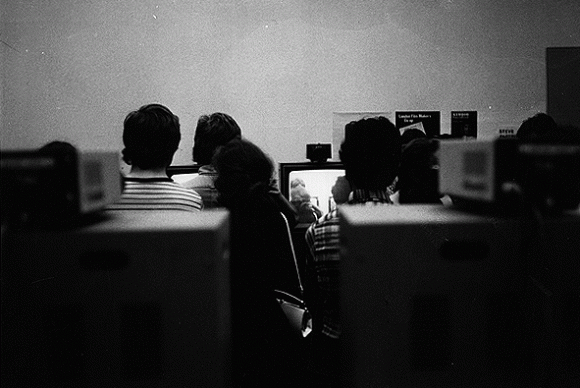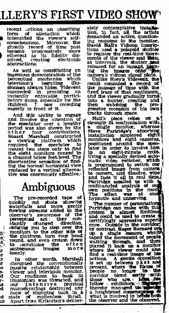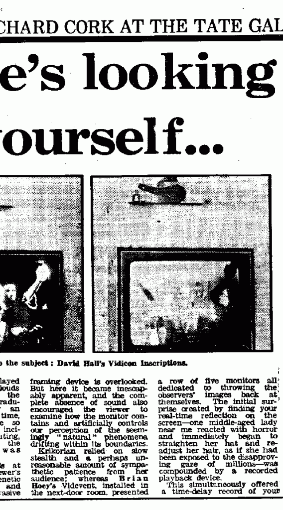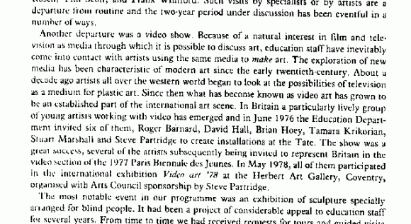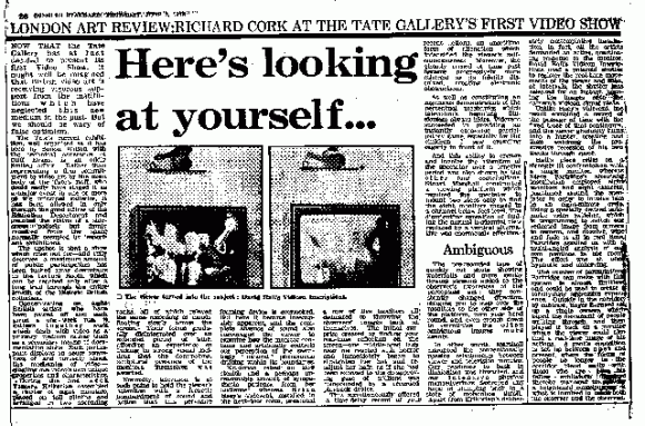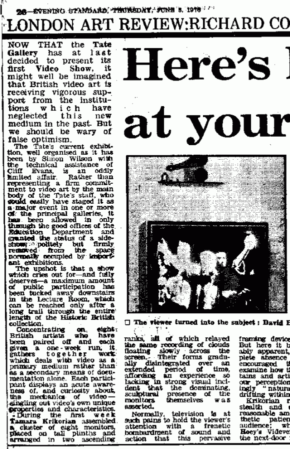 The exhibition was curated by the exhibition department of the Tate Gallery rather than the main gallery team who had not yet, recognized video as a ‘legitimate’ medium. They used their lecture theatre spaces – which although not ideal – served the purpose and gave exposure to the public for what was – at the time – a very new experience. Interestingly a PhD student was undertaking some research on audience participation at the time and asked if he could incorporate the Video Show in his project. His results showed that the average time spent looking at a painting or sculpture was 3-4 seconds but with this video show it was 3 – 4 minutes – unless the viewer was a practicing artist – in which case it was 0-2 seconds or, in other words – video – no way!