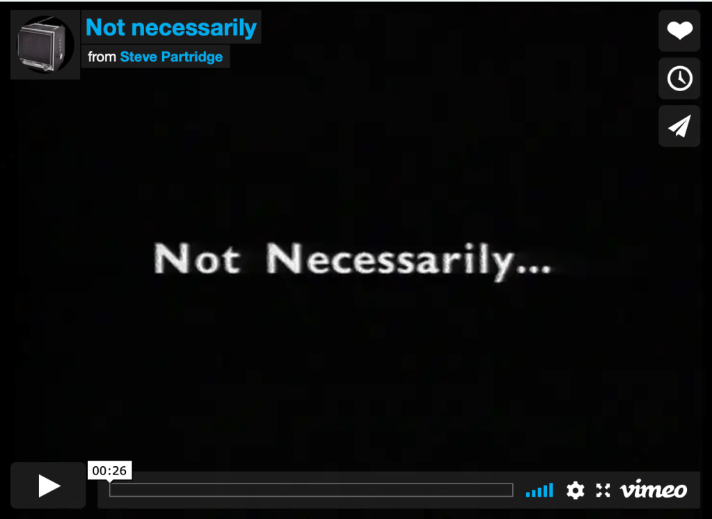 Not Necessarily….. New Works for Television a series of productions for BBC Scotland, broadcast on BBC2 July to September in 1991. A collaboration between BBC Scotland, Fields & Frames Productions and Duncan of Jordanstone College of Art, with Ken Macgregor as BBC Producer and Partridge co-producer. The eight programmes of 10 minute duration contained 4 new live action commissions and several pieces from ex-students in the Post-Grad Department at DJCAD. The commissioned artists were Lei Cox (Three Unanswered Questions), Kate Meynell (As She Opened Her Eyes), Doug Aubrey (Blood Tied and Colour Blind) and Judith Goddard (A Bluish Green). The Title Sequence was by Partridge with sound composed by David Cunningham.