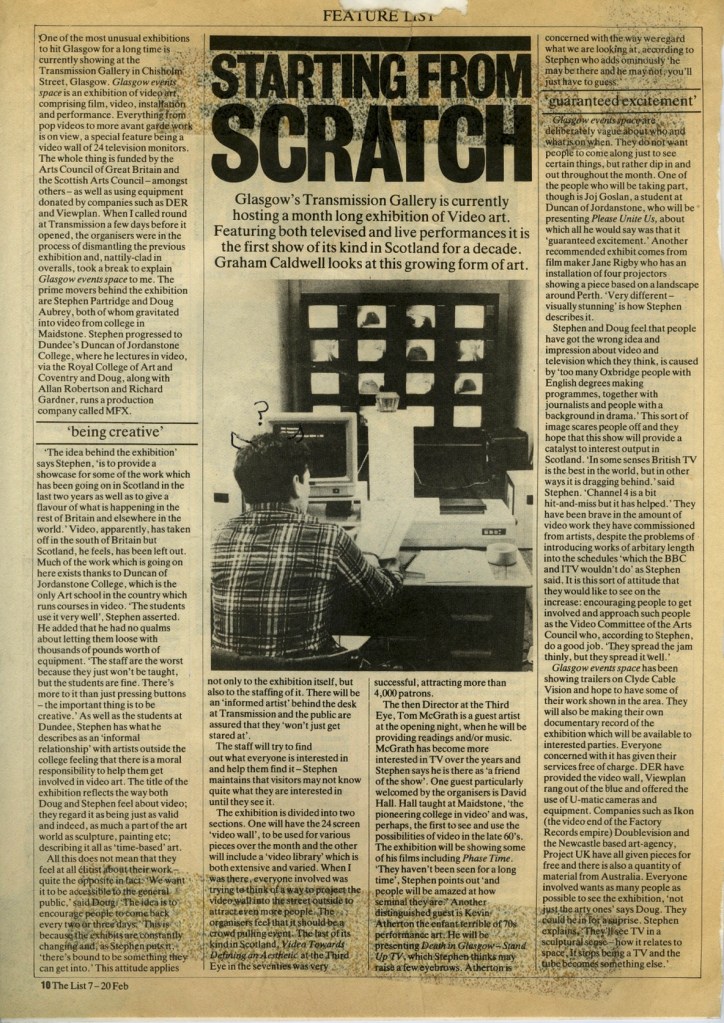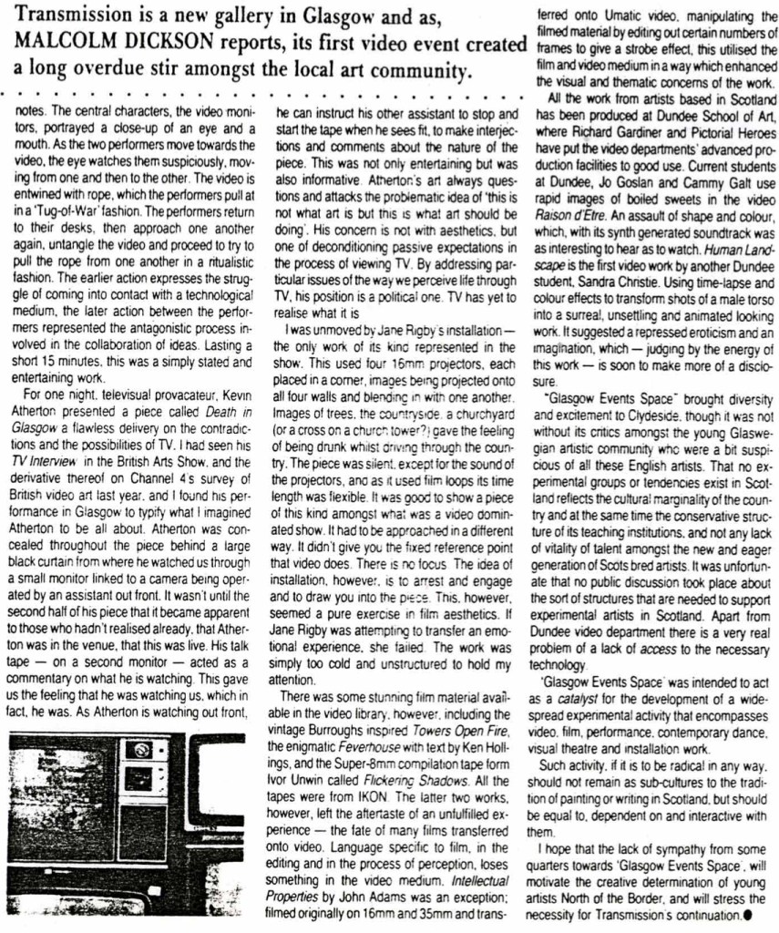 Glasgow Events Space 1, Transmission Gallery, February 1986. Curated by Malcolm Dickson, Steve Partridge, Doug Aubrey and Steve Littman. The first video show in Glasgow since the Third Eye Centre’s Video; Towards defining an aesthetic in 1976. The show included installations by Steve Littman, Jane Rigby (film), Zoe Redman, David Hall; screenings from Derek Jarman; and performances from Kevin Atherton, Tom McGrath and Peter Nardini.
