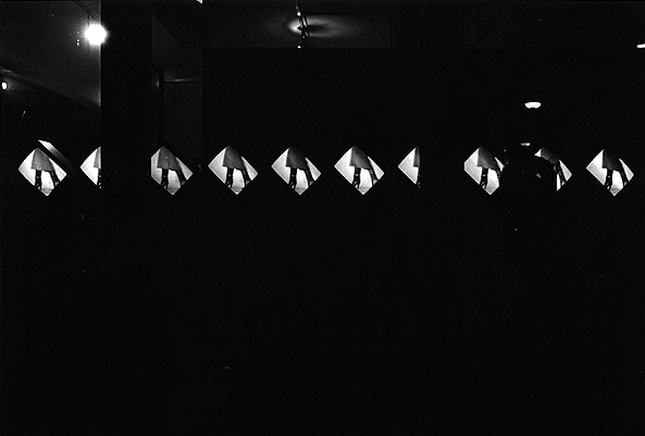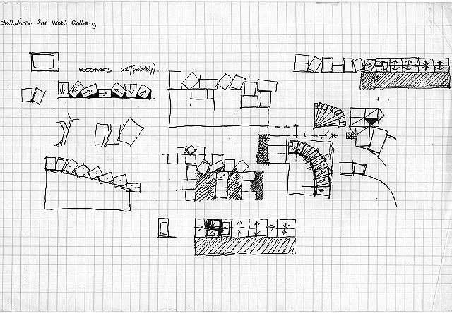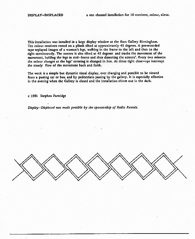 Display-Displaced 1981 12 x monitors. For Ikon Gallery, Birmingham. Commissioned for this one-person exhibition at the IKON Gallery, Birmingham in 1981.