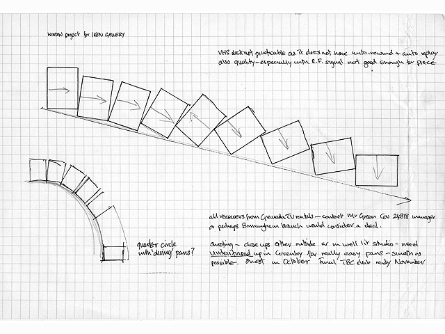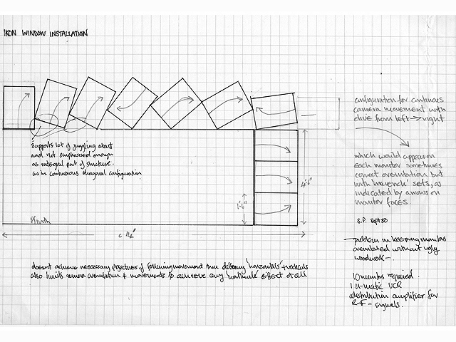 The installation for Ikon Gallery windows ‘Display – Displaced’ is by way of being our commission (made possible by an award to the artist by the Arts Council). When I spoke with Stephen Partridge recently he was, understandably reluctant to spell out in precise terms what the piece would be ‘about’, in advance of it – he prefers to allow for elements of change in the actual shooting and editing stages. On the other hand, he is certainly aware of all the possibilities (particularly in terms of the different ways the windows can be seen by passers by at random points outside the building and at various speeds) and aware too of the pun implicit in the project (TV stockists display windows). It is, I feel, a very nice marriage of situation and artist: the piece seems likely, even on the basis of the drawing, to encompass many of the strongest elements of Stephen Partridges work. I look forward to it. Hugh Stoddart, Nov. 1980