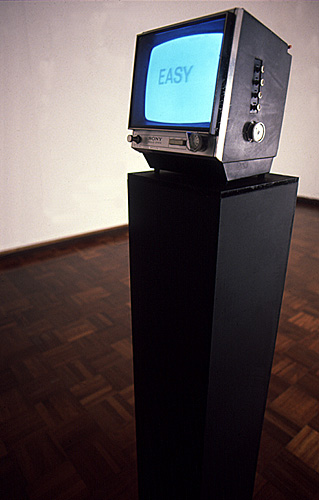 “Easy Piece is a very minimal work which confronts the spectators’ expectations of visual information. The screen is blank for most of the time but is interrupted at precise intervals by the image of the word ‘easy’, which is heard spoken in a rather sensuous tone. After a few minutes the word is expected and awaited even though its ambiguity becomes irritating and meaningless, contrary to its definition.