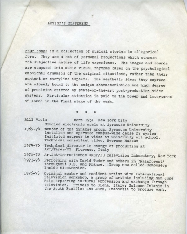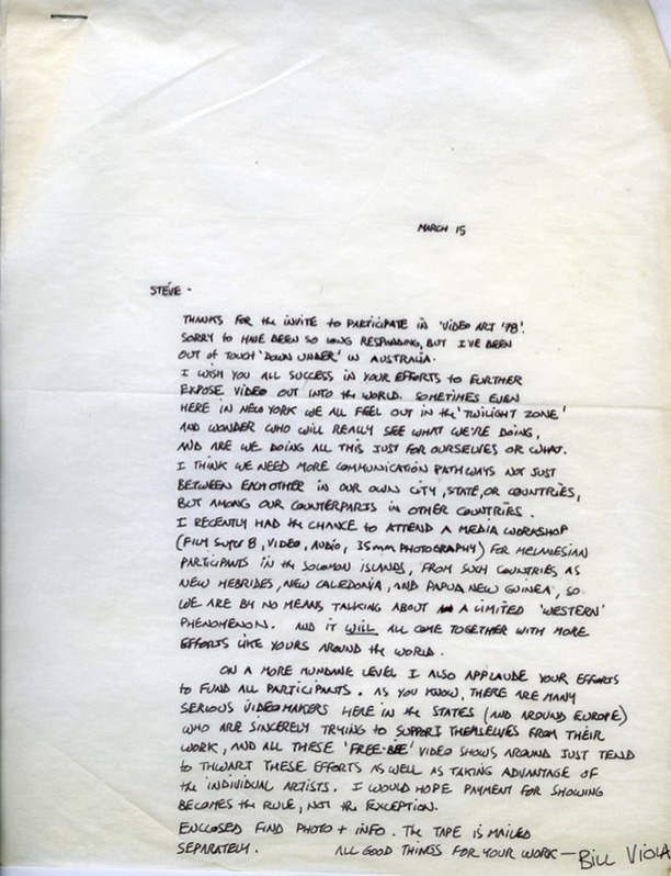In 1978 I curated a large video exhibition, Video Art 78 at the Herbert Museum Coventry including a new of video installations and screenings. One of the invited artists was Bill Viola who wrote and proposed a new work.