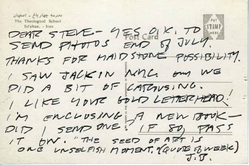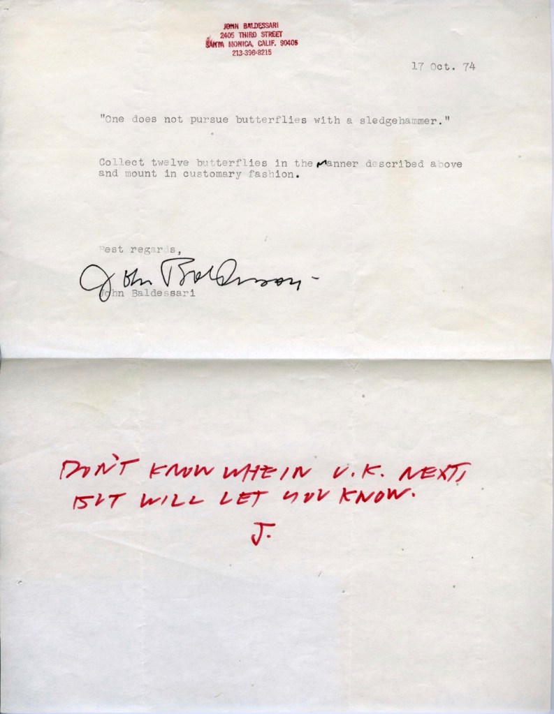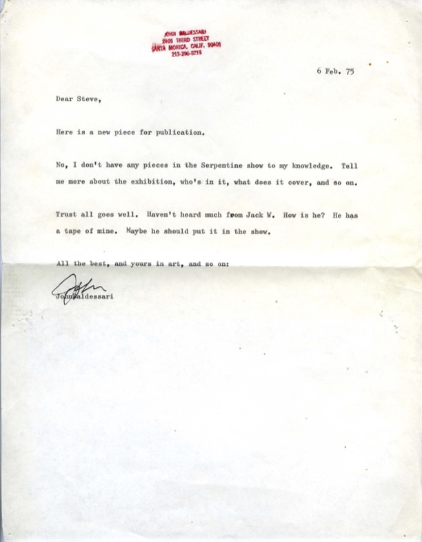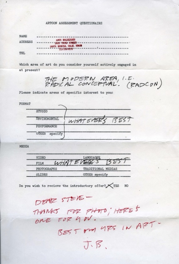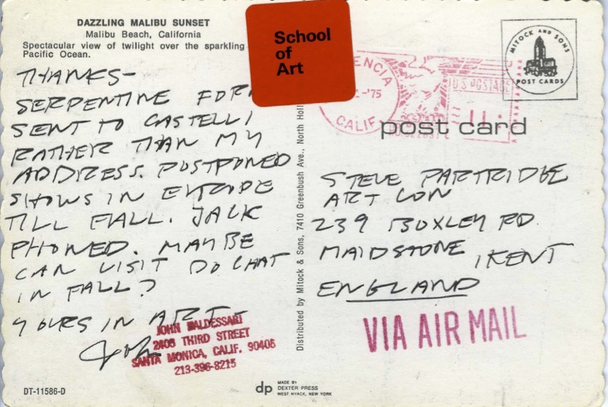 MAIL ART – While at Maidstone from 1973-75 I developed a Mail Art project called Artcon- The Agency of Art Ideas. Writing to friends and colleagues and artists, inviting them to mail us small art works via the post. The most significant correspondent was John Baldessari who I met a few times at the Jack Wendler Galley in London and who sent me a number of works and correspondence, examples of which are below.