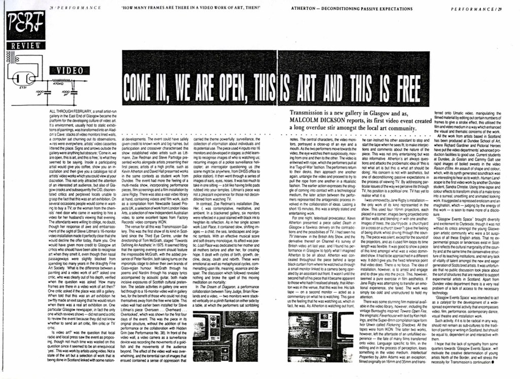 Glasgow Events Space 1, Transmission Gallery, February 1986. Curated by Malcolm Dickson, Steve Partridge, Doug Aubrey and Steve Littman. The first video show in Glasgow since the Third Eye Centre’s Video; Towards defining an aesthetic in 1976. The show included installations by Steve Littman, Jane Rigby (film), Zoe Redman, David Hall; screenings from Derek Jarman; and performances from Kevin Atherton, Tom McGrath and Peter Nardini.